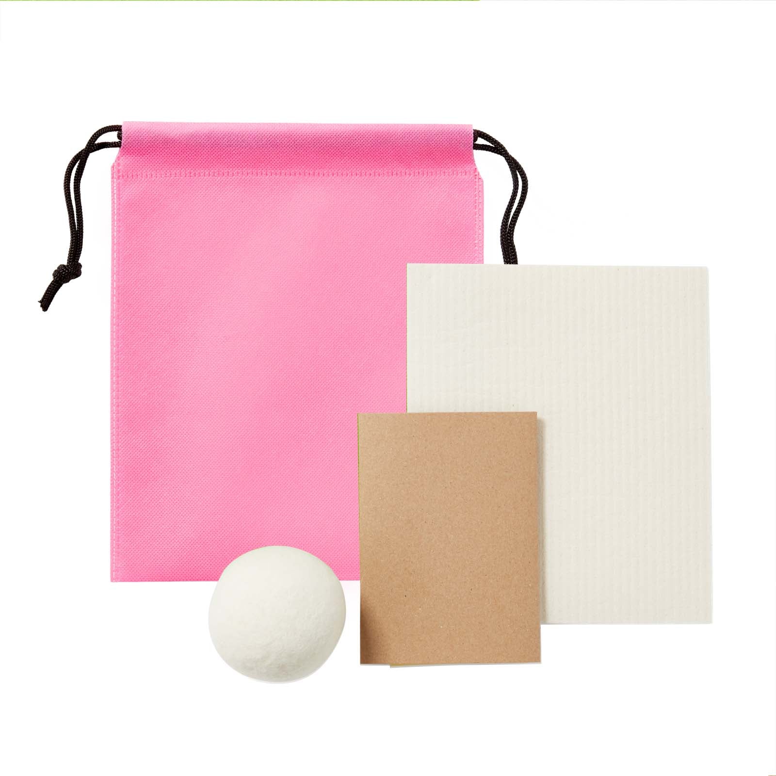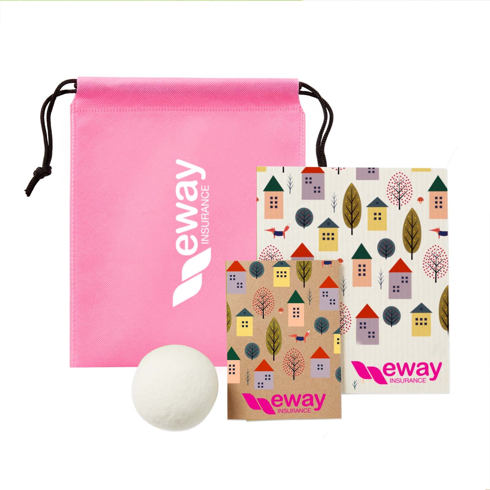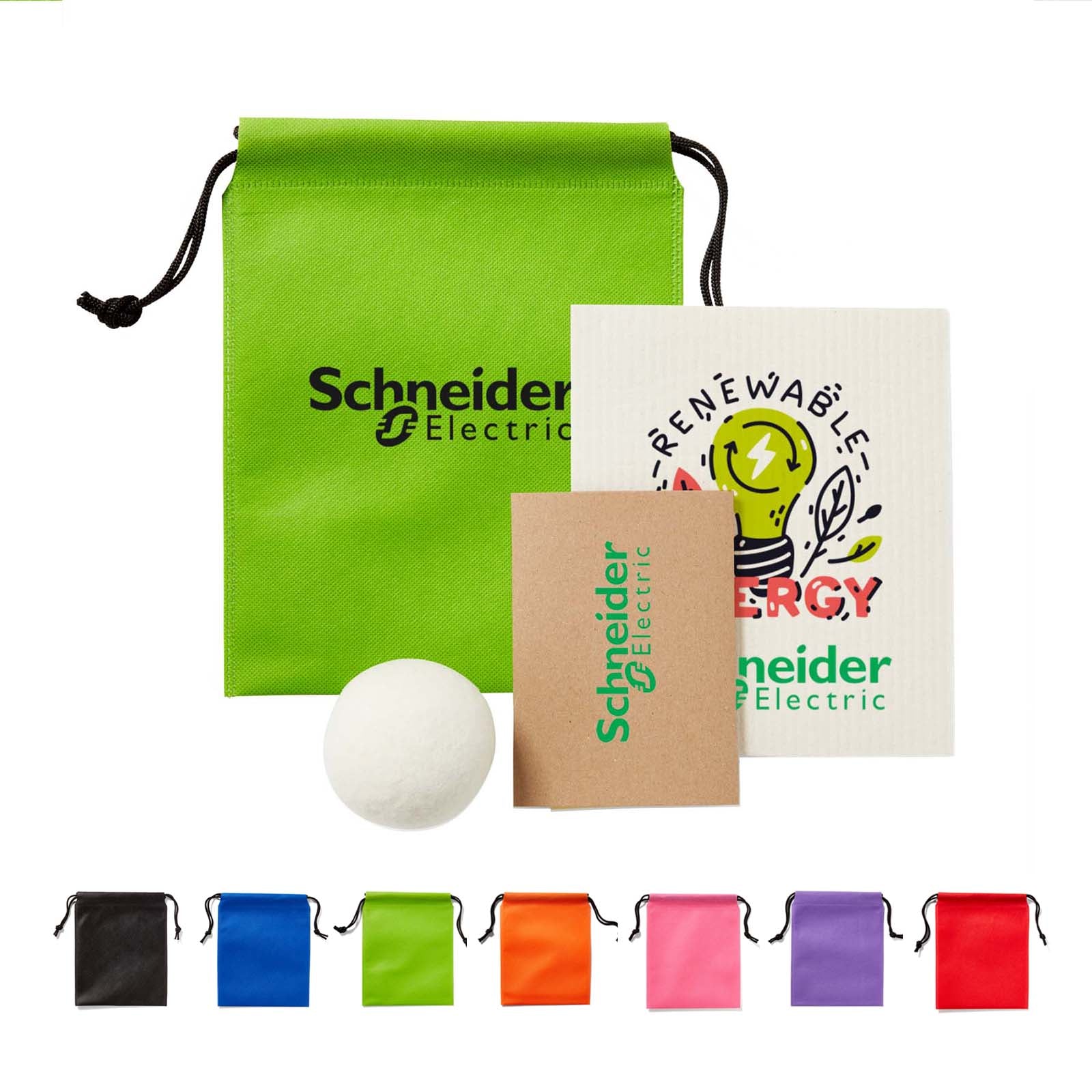 Promote your brand with these eco-friendly items! The Sustainable Starter Kit (JK-5887) includes our Small Single Bees Wrap (JK-9057), Custom Swee-Dish Cloth (JK-9055CUSTOM), and one of our 100% Pure New Zealand Wool Dryer Balls (JK-9040), all in a reusable Non-Woven Drawstring Pouch (JK-0067.) Pricing includes a full color imprint on the Bees Wrap and dishcloth and 1 color on the pouch.