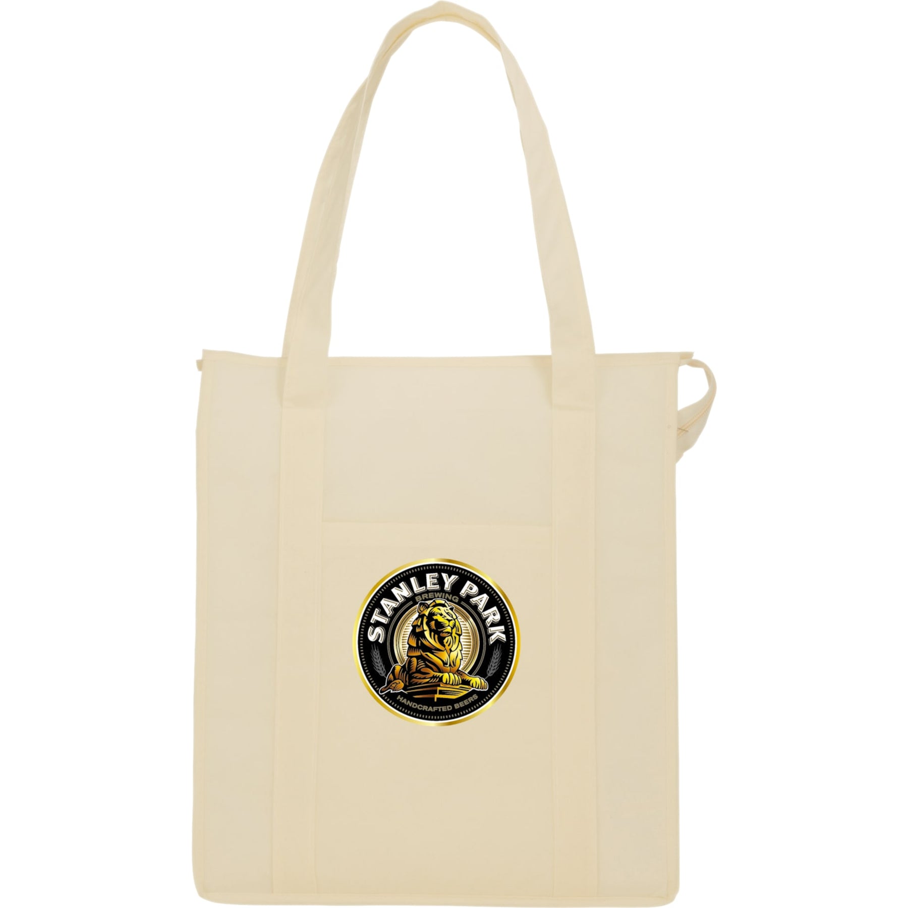 The Hercules Insulated Grocery Tote is as strong as its name suggests and offers a reusable alternative to plastic bags. Its interior is fully insulated with a heat-sealed, water-resistant lining to help protect your groceries and personal items. The Hercules features a zippered main compartment, a front open pocket measuring 9.7" H x 6.5" W, and double handles measuring 23". Material: 80G non-woven polypropylene Rugged, durable design Insulated with a heat-sealed, water-resistant lining Large main compartment with secure zipper closure Open front pocket for added storage Custom decoration available for gusset and handles..