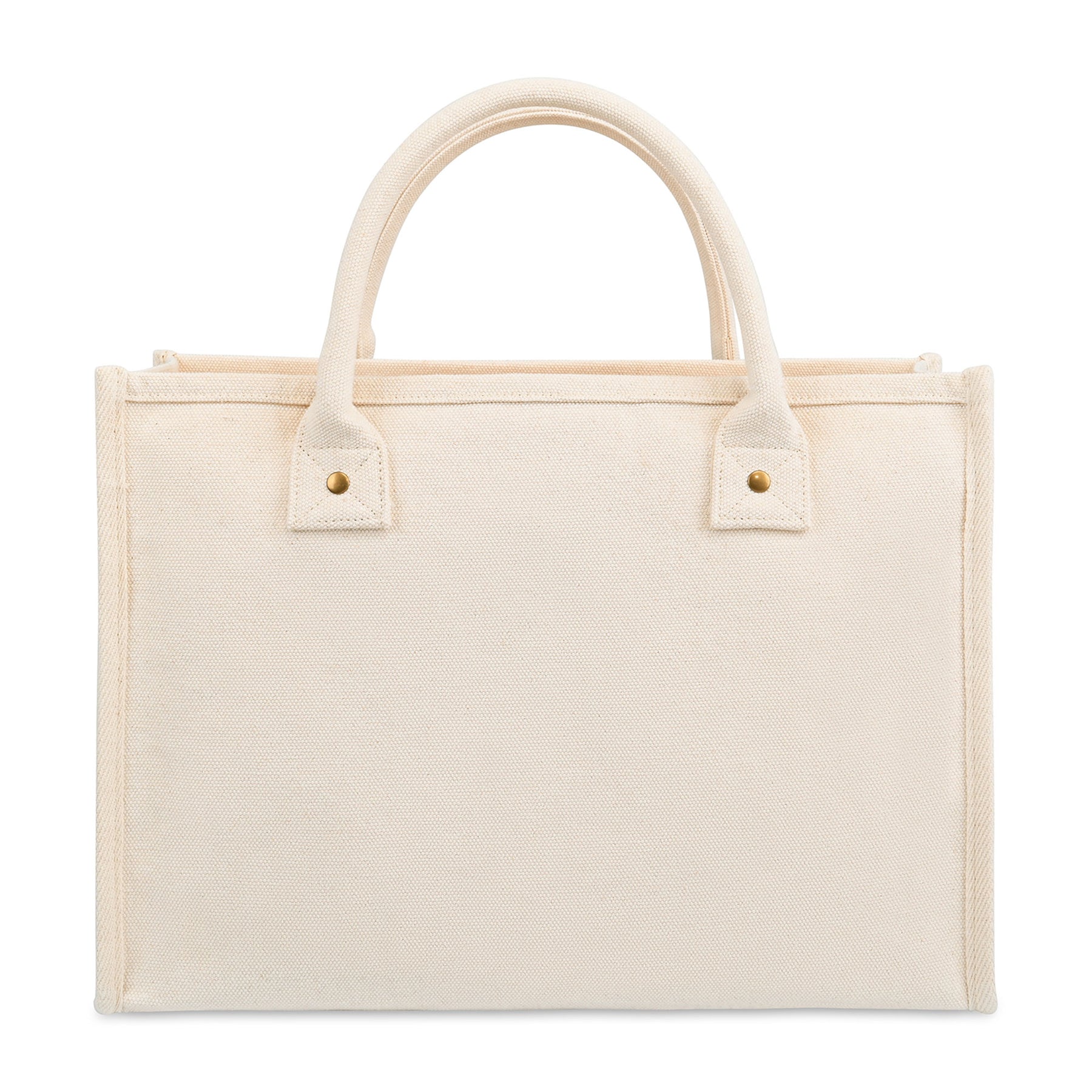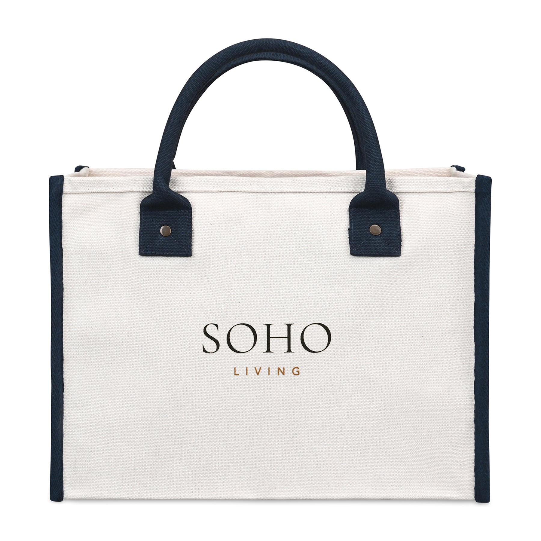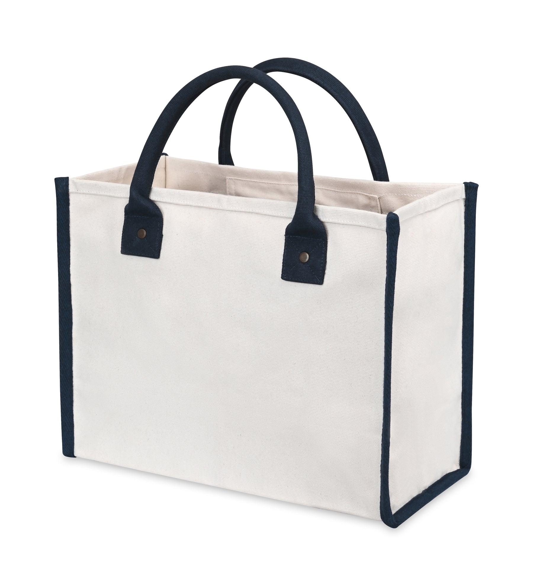 Timeless carryall. The Market Street Tote is the ultimate week-to-weekend bag, crafted from durable canvas with antique brass rivet details. Spacious enough for work or market runs, it features an interior pocket and rolled padded handles for comfort. Add a logo for a standout touch. Perfect for gifting—Eco-bow box #978 fits neatly inside. PVC free..