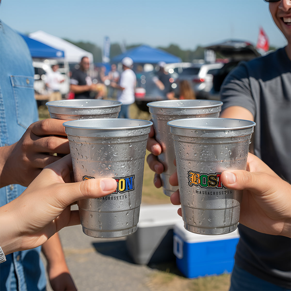 Made Of Recyclable Aluminum. Holds 16 Oz. Beverages. Reusable. Durable And Lightweight. Can Be Stacked Together For Easy Storage And Transport. Aluminum Material Chills Drinks Quickly And Keeps Them Colder For Longer. Great For Tailgating, Parties And Company Picnics. Meets FDA Requirements. BPA Free. Hand Wash Recommended. Made In USA. Check Your Local Recycling Abilities Before Adding To Your Recycle Bin..