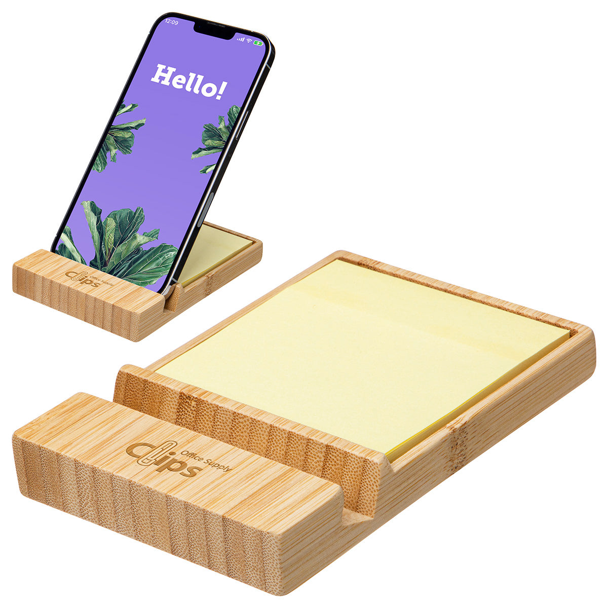 The FSC® Bamboo Sticky Note Dispenser with Phone Holder is made of renewable, FSC® certified, eco-friendly bamboo and functions as a bamboo phone holder and sticky note holder in one. Comes in a natural color with tone-on-tone laser engraving decoration and fits most smartphones vertically or horizontally. 50 sheets of 3" x 3" sticky notes included. Please note that due to variations in the natural materials, each wood and bamboo item is unique and will appear slightly different from other items of the same material..