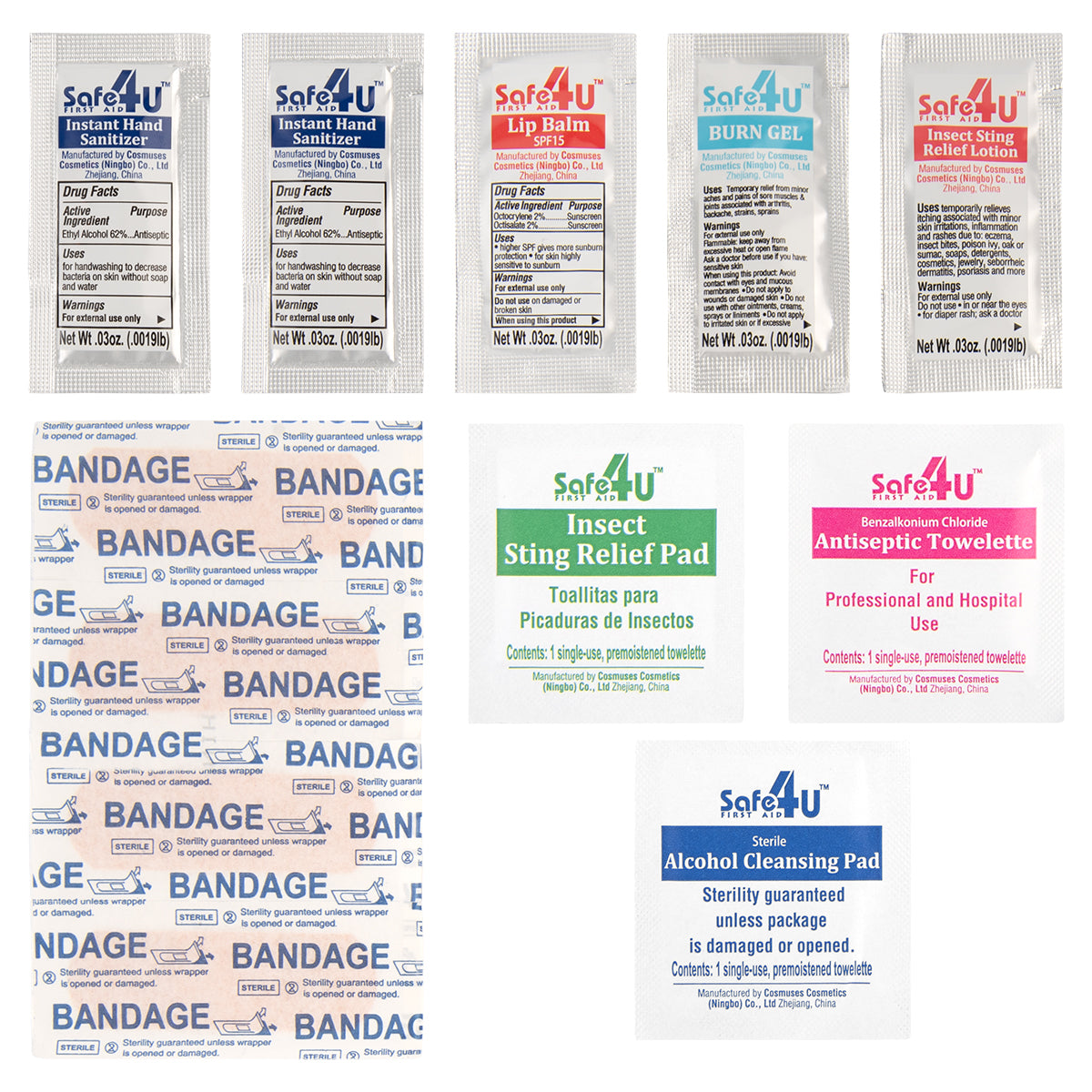 Includes 4 Short Adhesive Bandages, 2 Packets Hand Sanitizer And 1 Packet Each Alcohol Cleansing Pad, Antiseptic Towelette, Insect Sting Relief Pad, Lip Balm, Burn Gel & Insect Sting Relief Lotion. Protective Plastic Travel Case Fits Neatly In Backpack, Purse, Glove Compartment, Etc..
