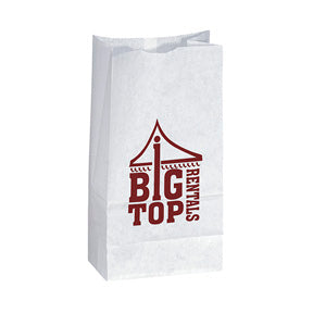 Unlined paper bags with serrated cut top, side and bottom gussets. Ink Imprint.