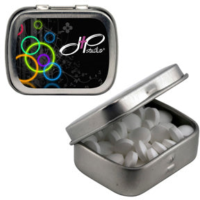 Create a long-lasting promotional campaign, with these mini hinged mint tins. Includes full color decal or one color direct print for your retail look. This hinged mint tin holds approximately 0.33 oz of sugar free mints. These mint storage tins are great to give away at conventions, hotels and more! FDA Registered / Approved.
