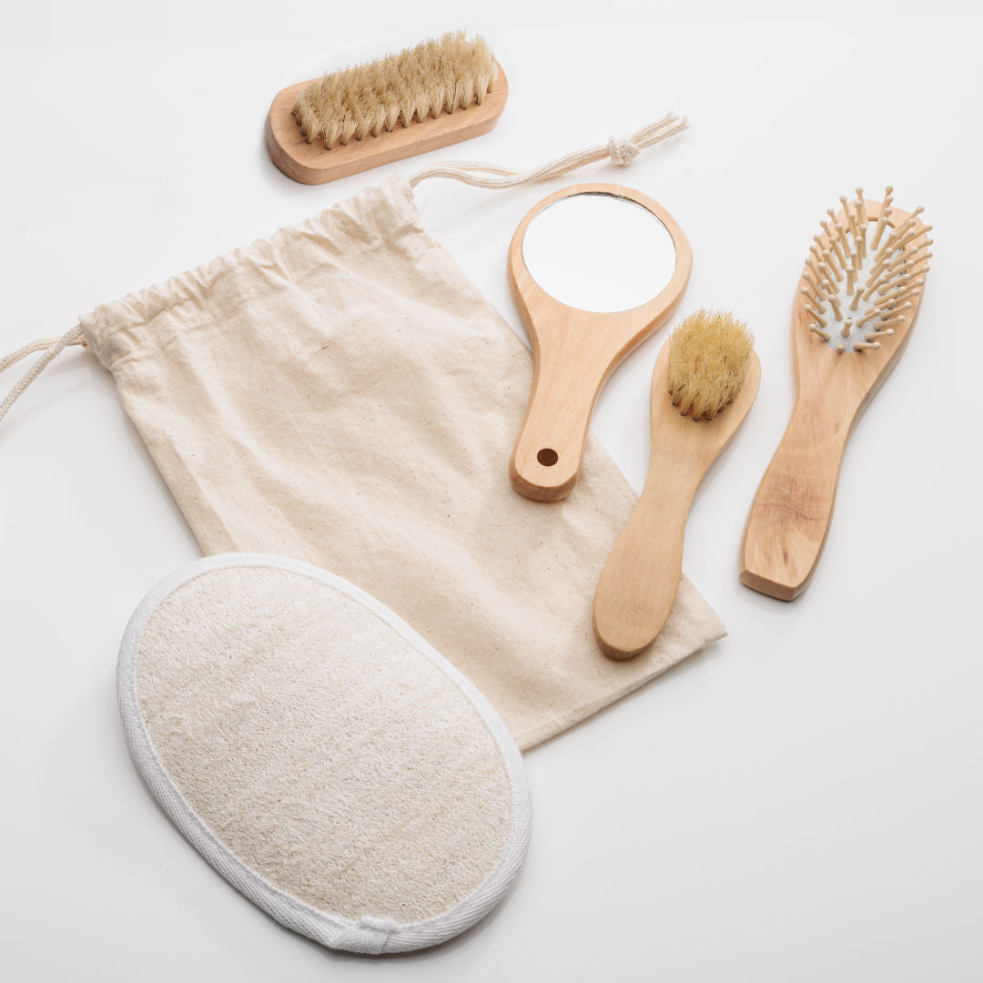 Treat yourself with The Relaxation 5pc Spa Kit! This luxury spa kit includes a loofa scrubber pad, massage brush, facial brush, nail brush and mirror all packaged in a cotton drawstring bag. Product Size: 6" W x 8.875" H.