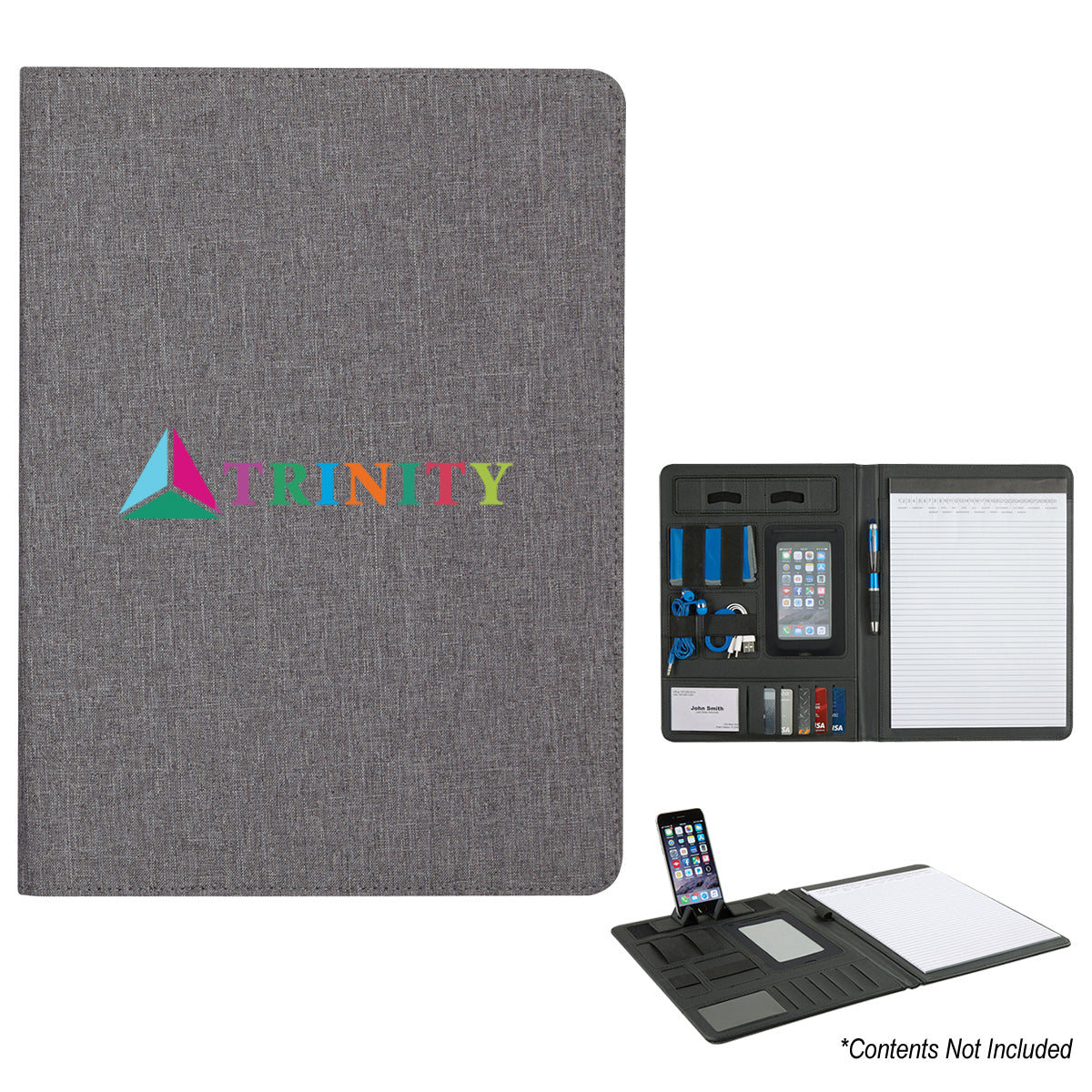 Includes 30 Page 8 ½" x 11" Lined Writing Pad. Slots And Pockets For Multi-Media Organization. Phone Or Tablet Stand. Holds A Variety Of Phone Sizes For Easy Viewing. Card Holders, Elastic Pen Loop And ID Holder. Made Of Polyester..