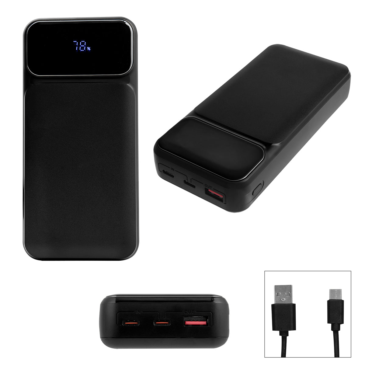 Fast Charging Capability. Digital Power Level Indicator. Over Current, Over Voltage, Over Charge And Over Discharge Protection. Features Apple® 8-Pin, Micro-USB & Type-C Inputs (Built-In Cord). Wireless Output: 15W. 20,000 mAh Lithium Ion Battery. Charges Most Devices. Apple and iPhone are trademarks of Apple Inc., registered in the U.S. and other countries..