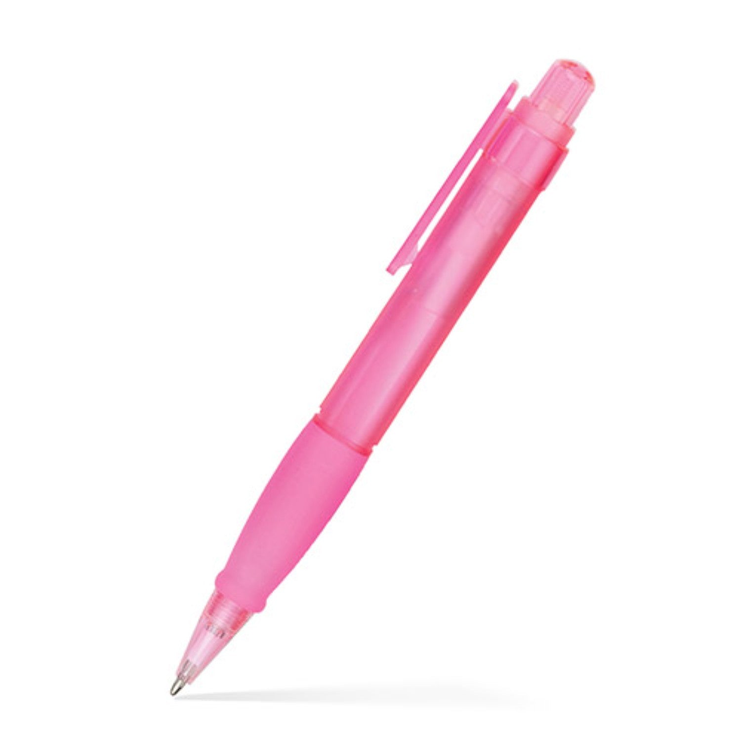 The Aspen Click Pen is a translucent retractable click pen with a wide barrel, colored plunger, and matching rubber grip. It’s available at an amazing price. Black or white imprint suggested..