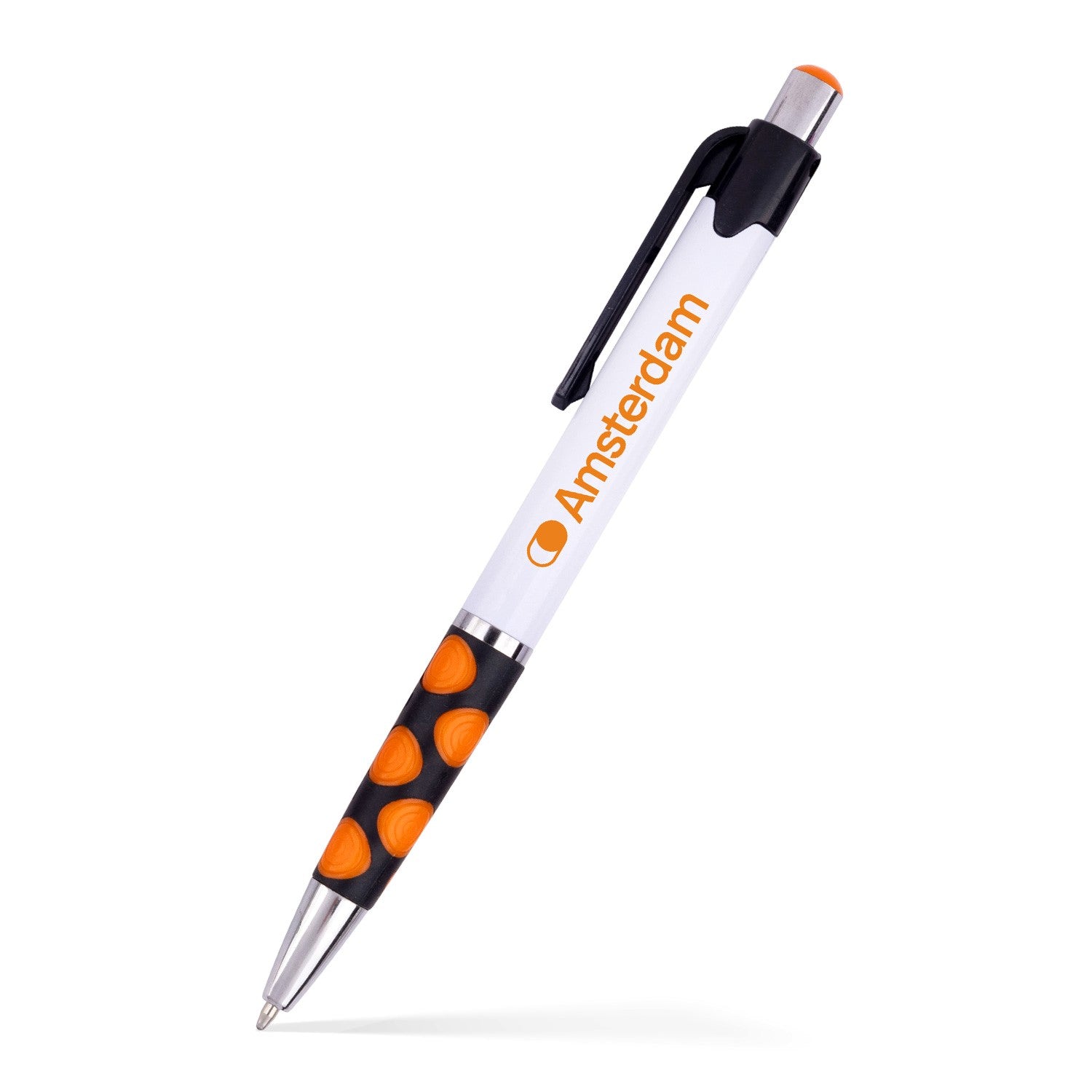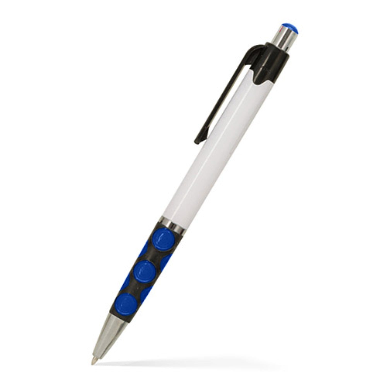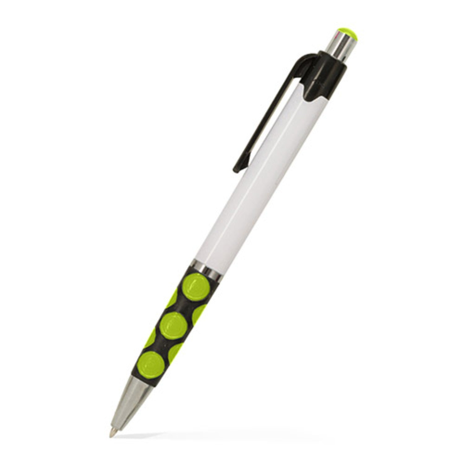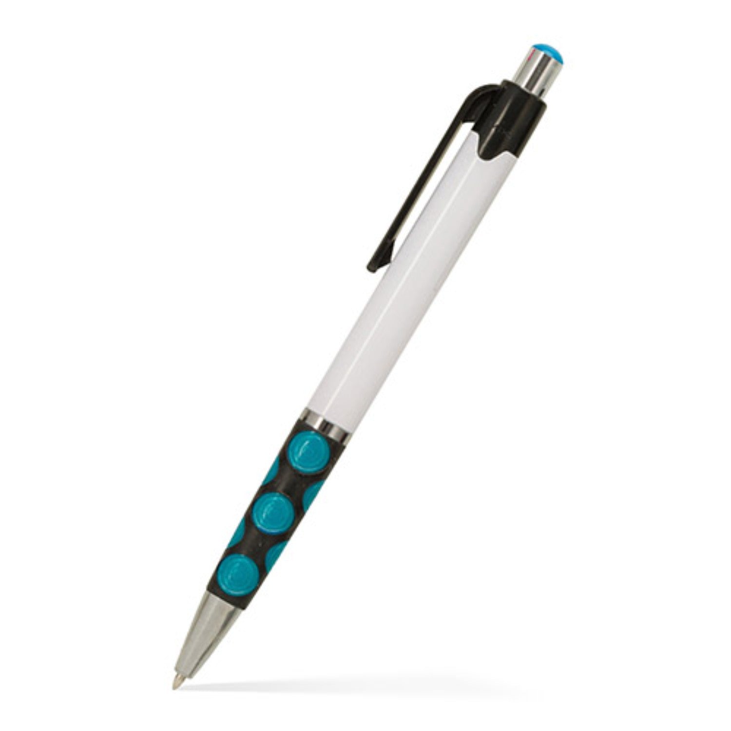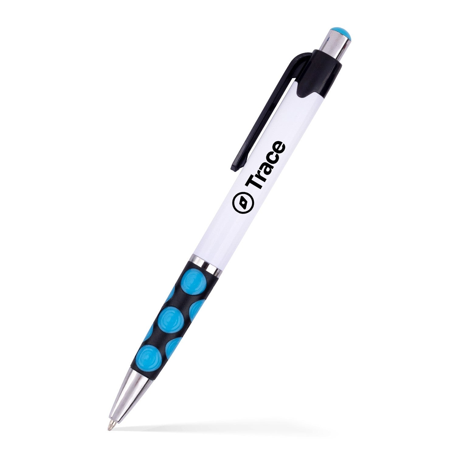 Make a statement with the Madeline Click Pen. This retractable click ballpoint click pen features a unique ergonomic grip and a sleek white barrel.Available in multiple vibrant grip and tip colors, it’s designed for style, comfort, and superior writing quality..