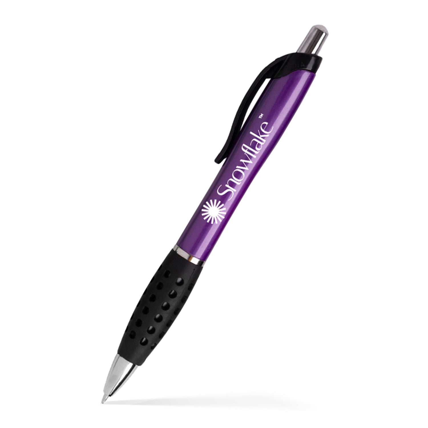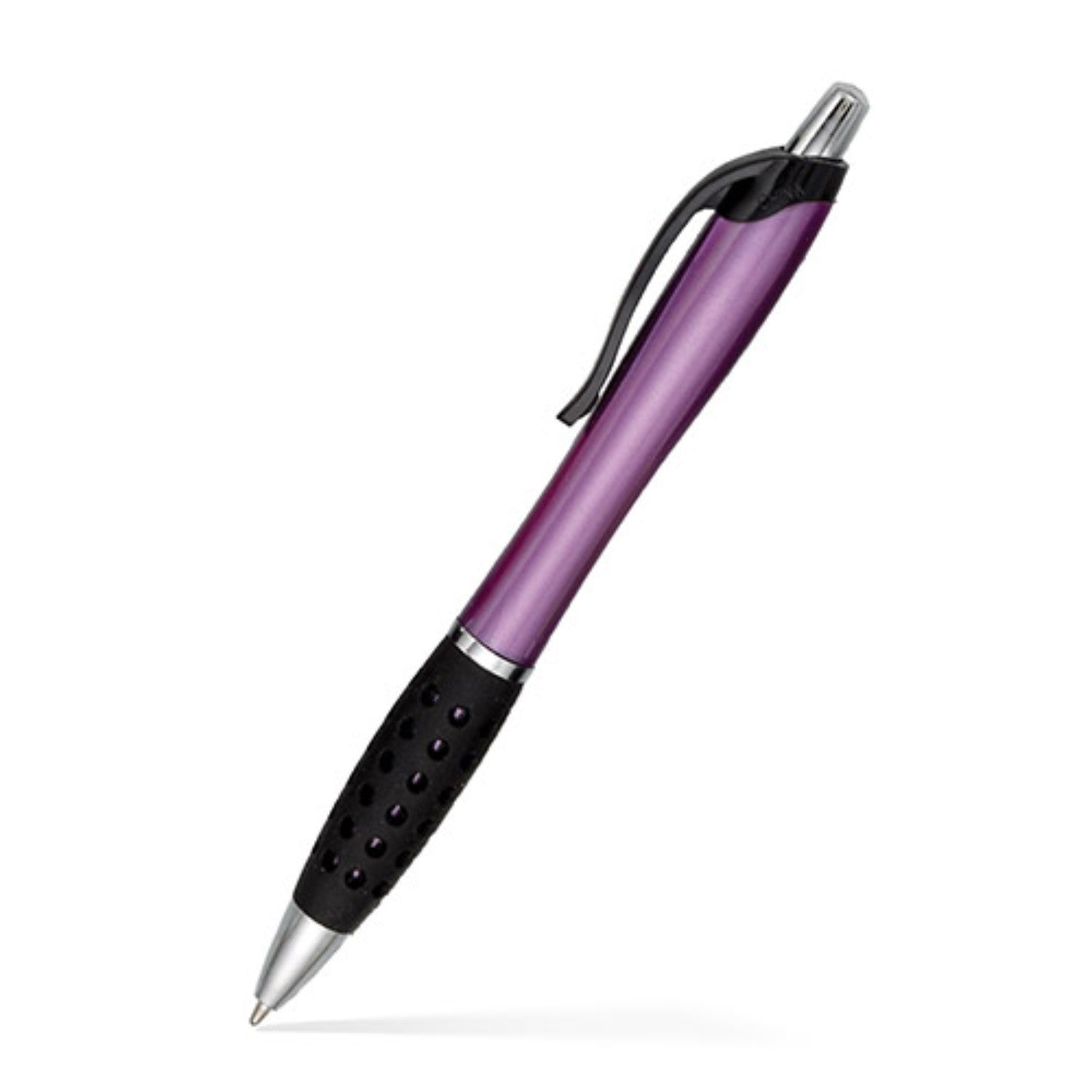 A classy and contoured curvaceous barrel, with a black dotted rubber grip, this hourglass shaped retractable click pen is definitely a great value for a modest price. Medium point, black ink. Colored barrel..