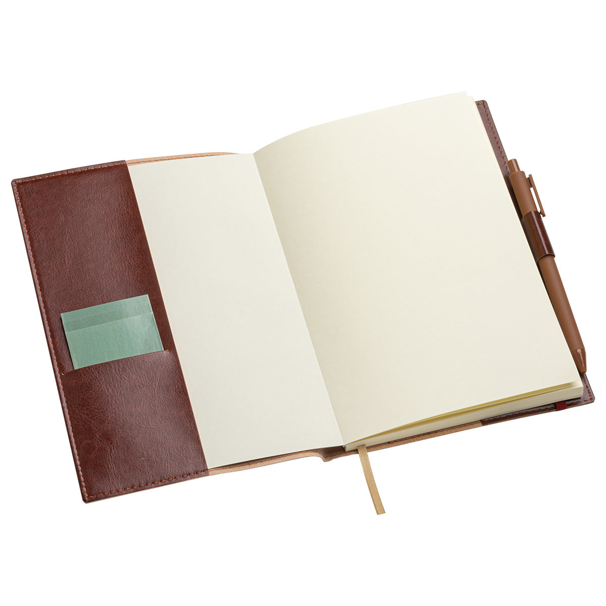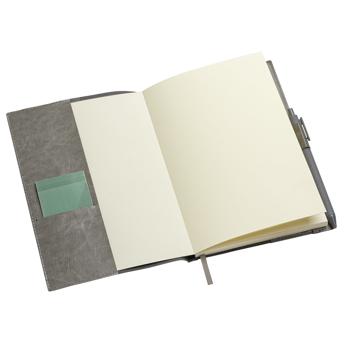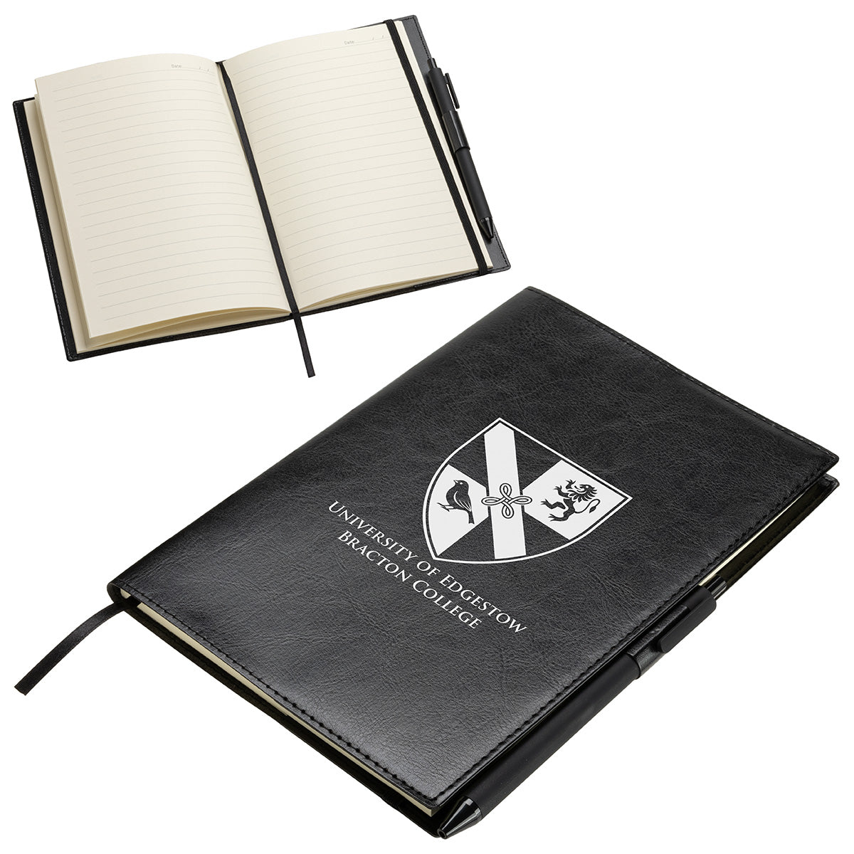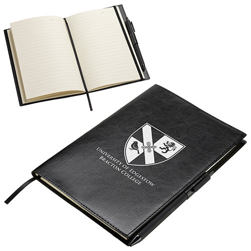 Our Conclave Journal is made of a faux leatherette cover and includes a refillable 80 sheet paper pad using 80GSM Ivory ruled paper with date field, ribbon bookmark, elastic ribbon closure, pen loop and business card pocket. Color matched click gel pen with black ink and clip perfect for leatherette journal..