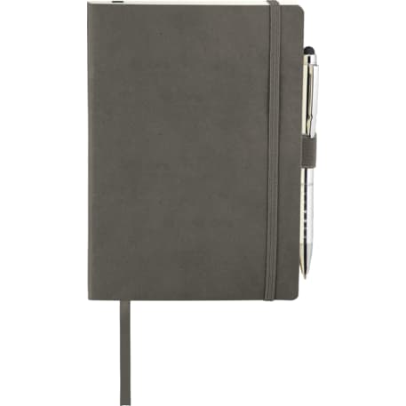The Revello Soft Bound Journal Bundle Set includes one 5" x 7" Revello Soft Bound Journal (2700-67) and one Preston Dual Ballpoint Stylus (1065-08), bringing two classic essentials together. The included UltraHyde notebook has a document pocket on its interior back cover, contains 80 sheets of cream lined paper, and shuts with a built-in elastic closure. The journal also contains an integrated pen loop and ribbon page marker. The included stylus is eligible for free laser set-up..