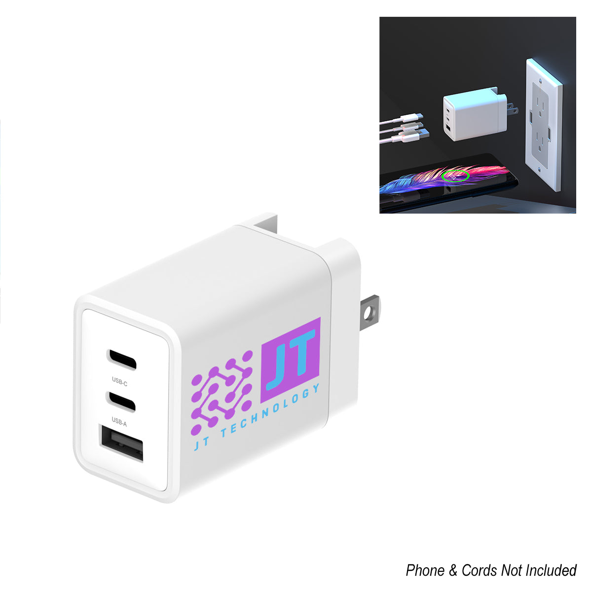 Made Of Polycarbonate Composite. Minimal, Ultra-Small And Portable. Foldable AC Wall Prongs And High-Speed Charging Capabilities. Features 1 USB-A & 2 USB-C Output Ports. 65W Power Delivery. Designed To Charge At Home, Office & Traveling. GaN Fast-Charge. Charge Up To 3 Devices Simultaneously . Features A Type-C Input. Compatible With Laptops, iPhone® 16/15/14/13/12/11/X, iPad®, Samsung Galaxy, Google & More. Smart Chipset Provides High Quality Power Output And Charging Safety Monitors With Voltage, Short Circuit, Temperature And Current Protection Features. Apple, iPhone, and iPad are a trademark of Apple Inc., registered in the U.S. and other countries. Samsung is a registered trademark of Samsung Group, registered in the U.S. and other countries..