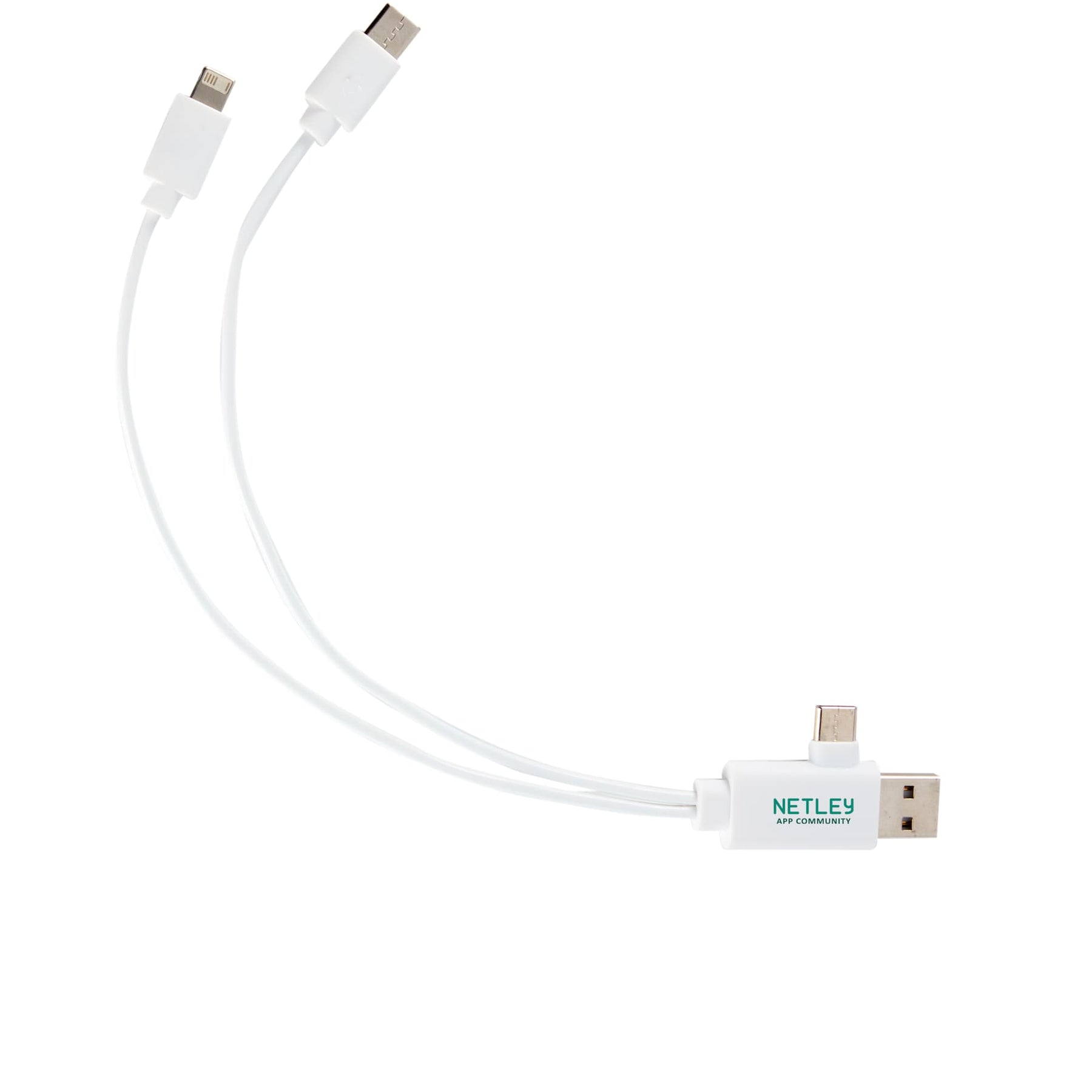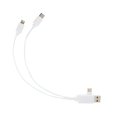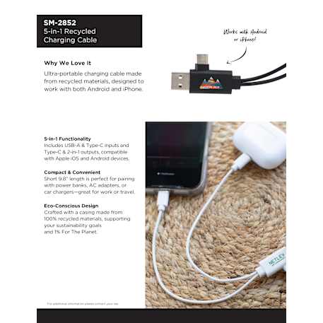 The 5-in-1 Recycled Charging Cable features 9.8-inch long, with a USB Type-A input tip and a USB Type-C input tip at one side, and the other side contains one cable with a Type-C output tip and the other cable with a two-in-one dual compatible tip for both Apple iOS and Android devices (up to 5V/2A, 10W charging speed). It features casing crafted from 100% recycled materials. It is recommended to use an AC adapter, power bank or car charger to charge devices, instead of using outputs from laptop or computer as power source..