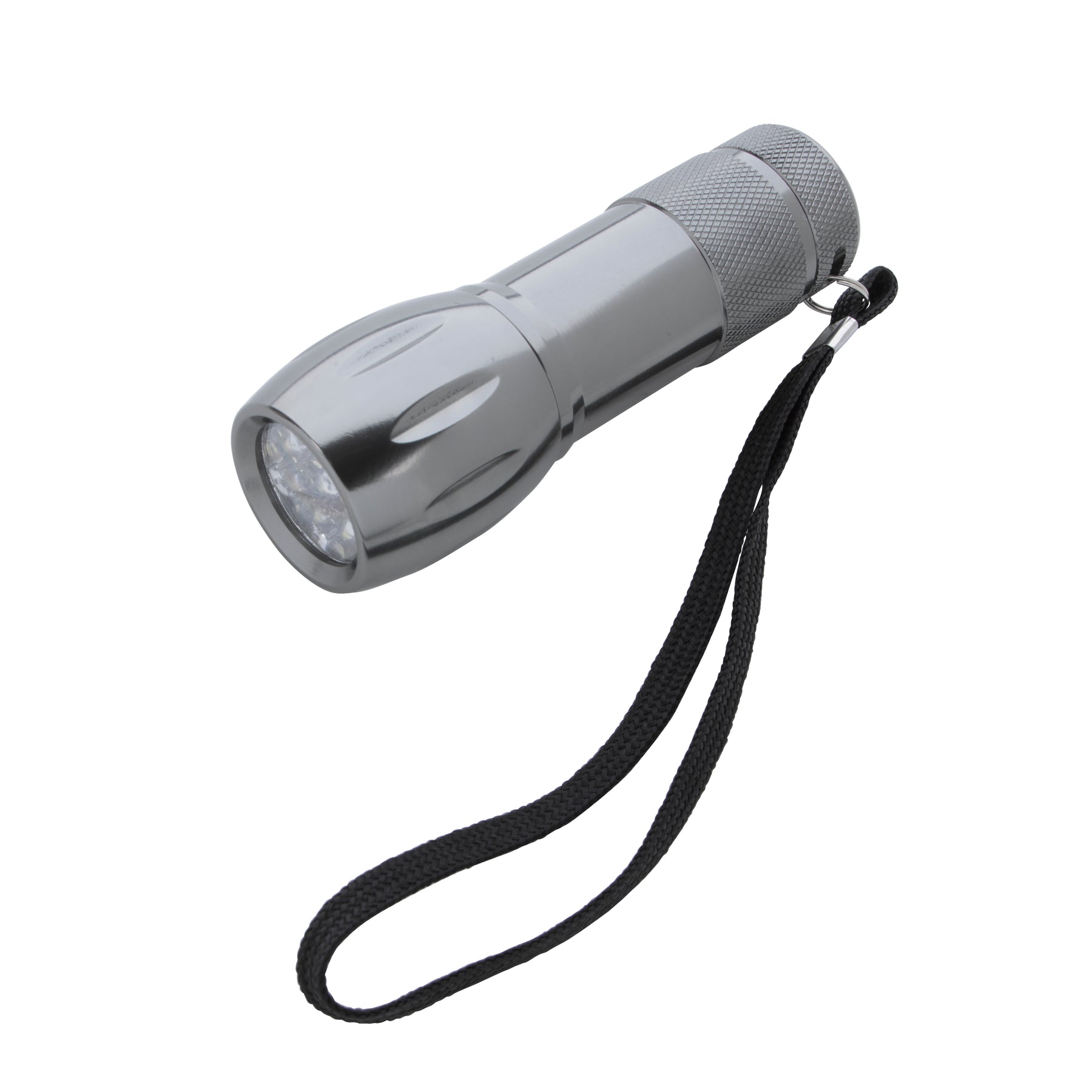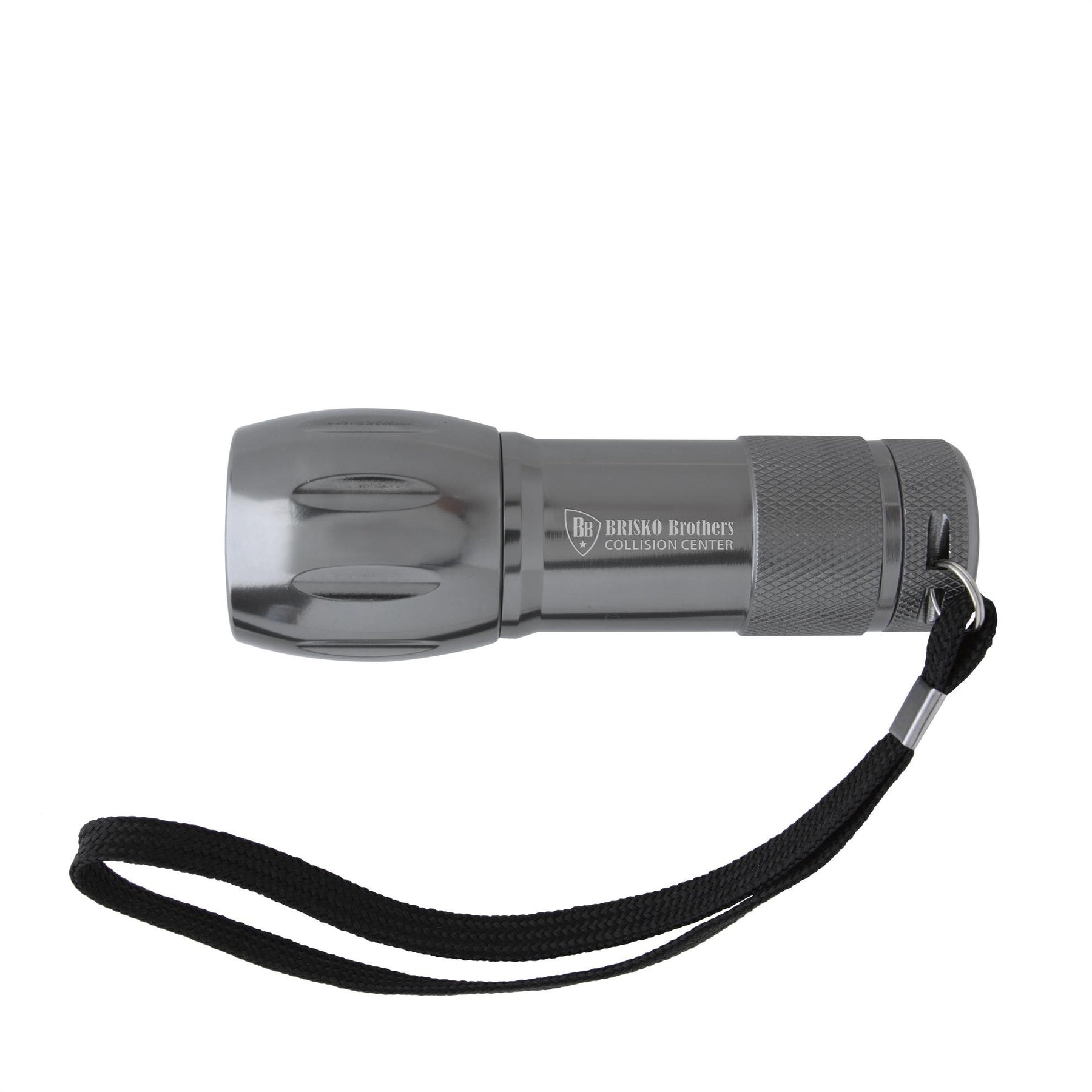 This aluminum flashlight featuring 9 ultra-brite LEDs, will safely light the way at home, on the road or in the great outdoors. Flashlight comes packaged in white gift box with batteries included. Add an optional black pouch, see charges tab for details.
