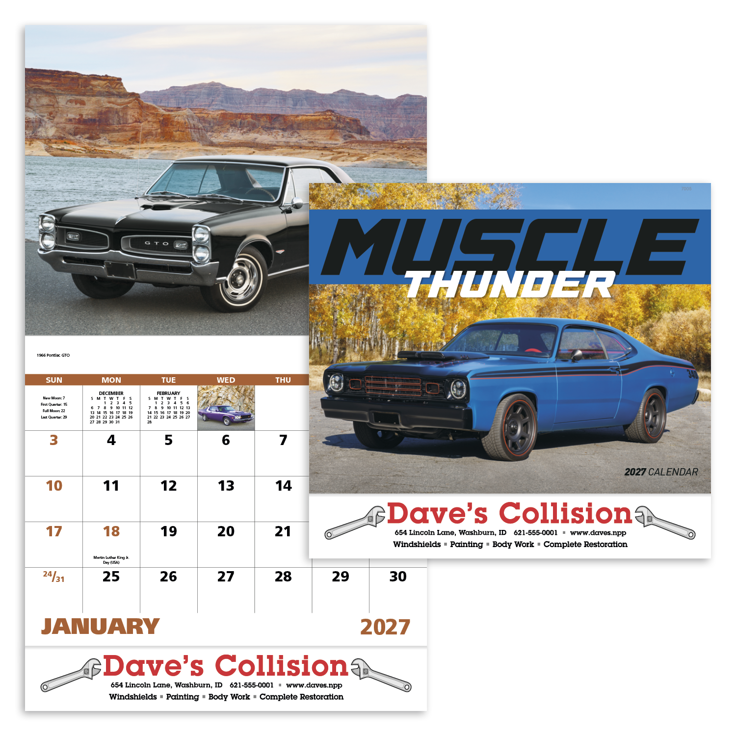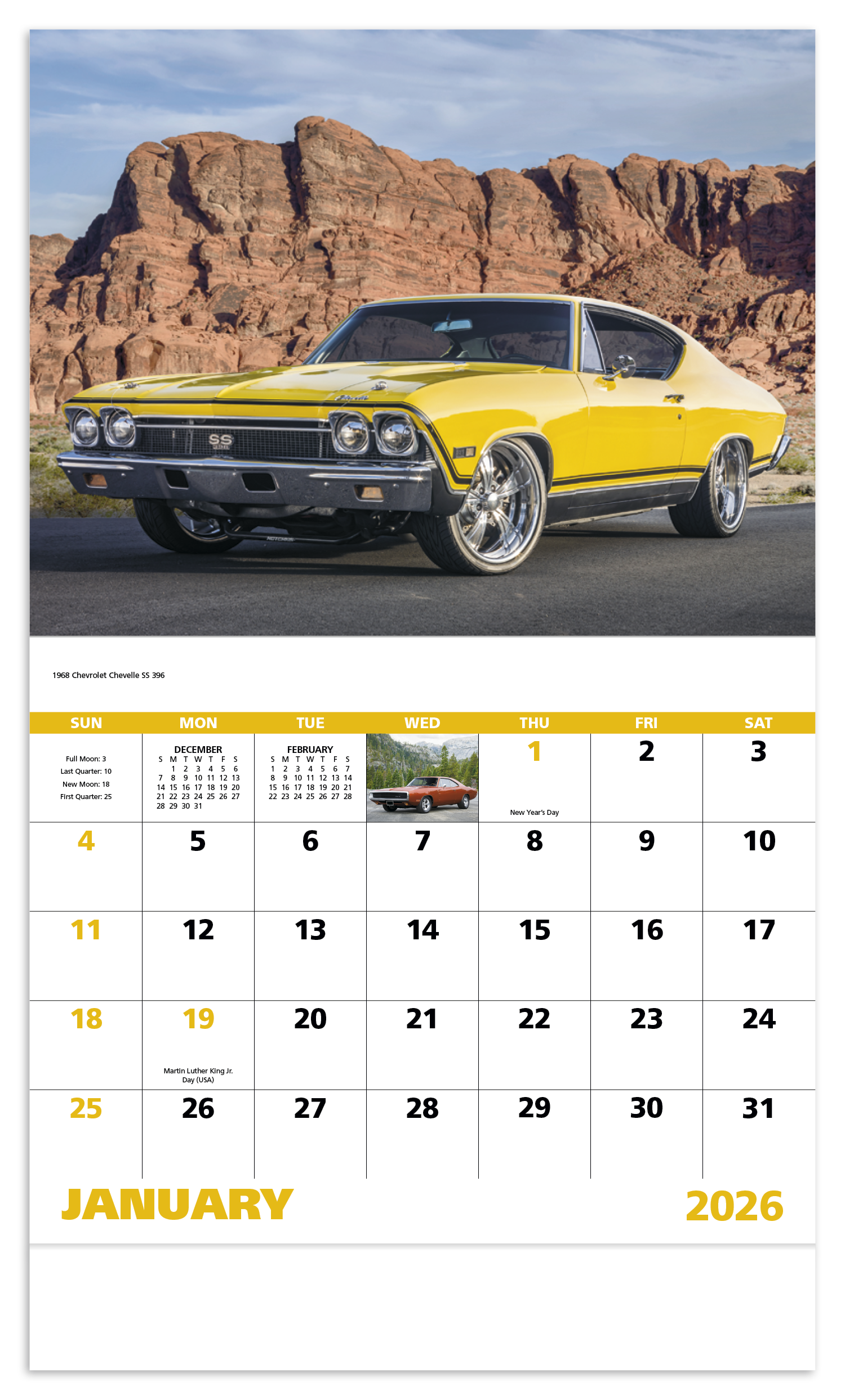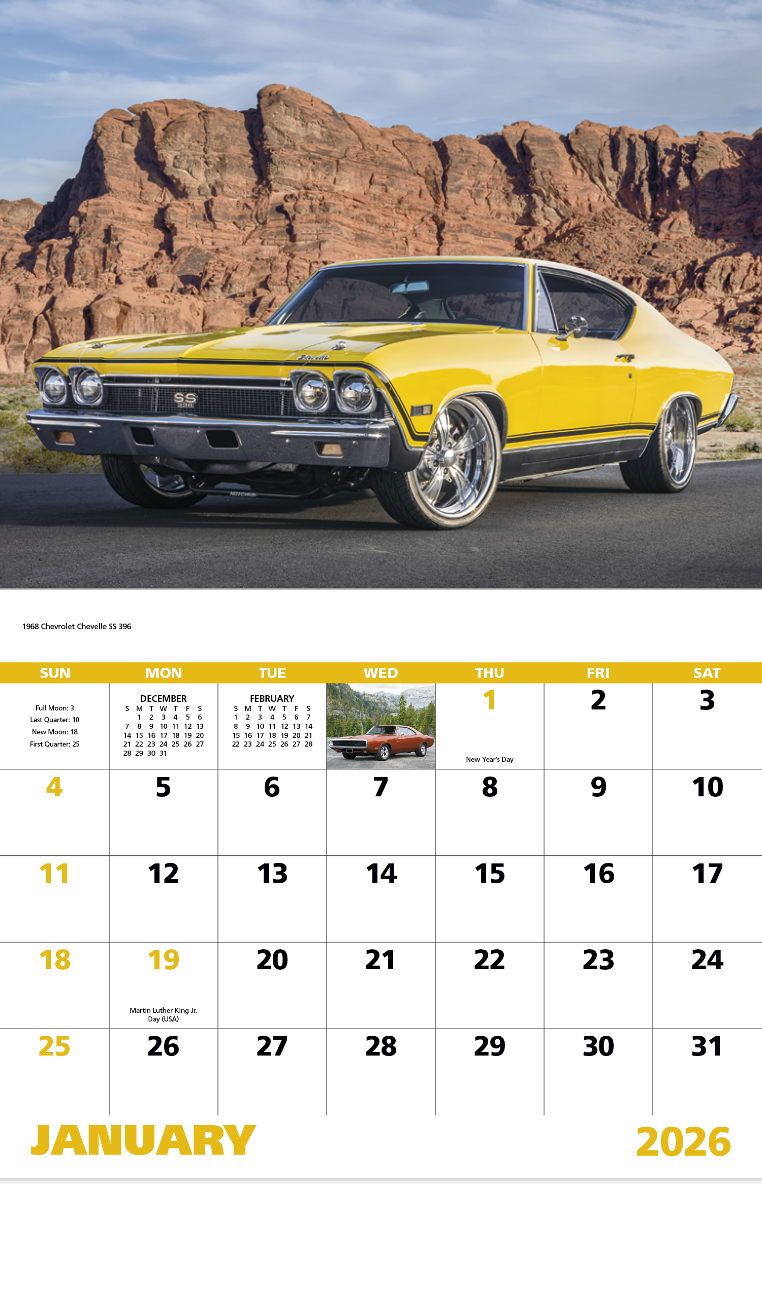 Relive the excitement of the muscle car era as 13 powerful street cars rev to life on this calendar. The FSC® label means that the materials used for this product come from well-managed FSC®-certified forests and other controlled sources..