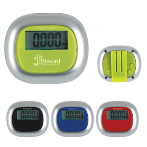 Multi-function pedometer. Easy to read display. Molded clip on back belt attachment. Counts steps, miles, kilometers and calories. Silver trim.