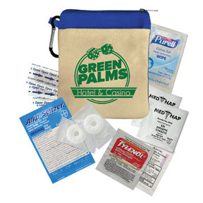 New recovery kit canvas zipper tote kit. Everything you need after a late night. Extra large canvas cotton tote with a 50mm carabiner that hooks to anything. Brand name amenities. FDA compliant components. Contains Tylenol pain reliever, Alka Seltzer antacid packet, Purell hand sanitizer, 4 adhesive bandages, 2 Life Savers mints, 2 antiseptic towelettes, and 1 triple antibiotic ointment packet. Custom kits available. Please call for details.