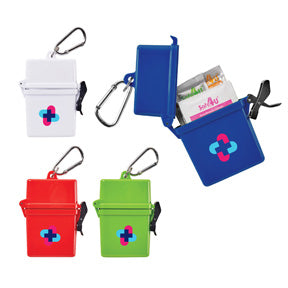 • The Trek 8-Piece Waterproof First Aid Kit is a mini first-aid kit in a flip-top waterproof floating container with metal mini-carabiner for convenient first aid care. The kit includes 2 adhesive bandages 2 antiseptic wipes 1 Hand Sanitizer packet (2) SPF30 Sunscreen packets and 1 aloe, after sun care packet. Sunscreen does not contain Octinoxate or Oxybenzone. Meets FDA requirements and is available for shipment within the United States (including Alaska Hawaii and Puerto Rico). Not available for export. See General Information page for additional air shipment charges.