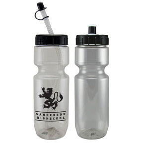 Clear 22 ounce bike bottle with option of a push pull or straw tip lid. Your choice of front imprint, front and back imprint, or wrap imprint. This bottle includes a rim imprint area at no additional charge.