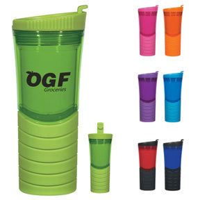 16 oz. Double wall banded gripper bottle. BPA free. FDA approved. Screw on, flip-top sipper lid locks in open or closed position. Non-slip grip. Double wall construction for insulation of liquids.