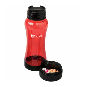 This customized 22 oz. water bottle features a large removable child-resistant pill box on the bottom with two separate compartments that could also store keys, money, etc. It is Earth safe and BPA free. Proposition 65 compliant.