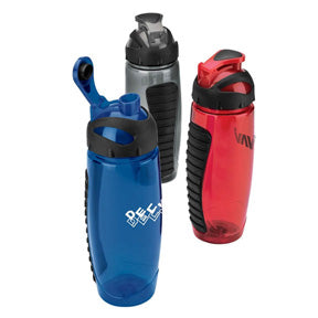 Grab this great water bottle and go! It will be sure to keep you refreshed and moving. This 22 oz. bottle has a exciting new design, rubber grip, and a flip top closure with an easy to drink spout. BPA-free Tritan material water bottle with side grips and flip-top drinking spout.